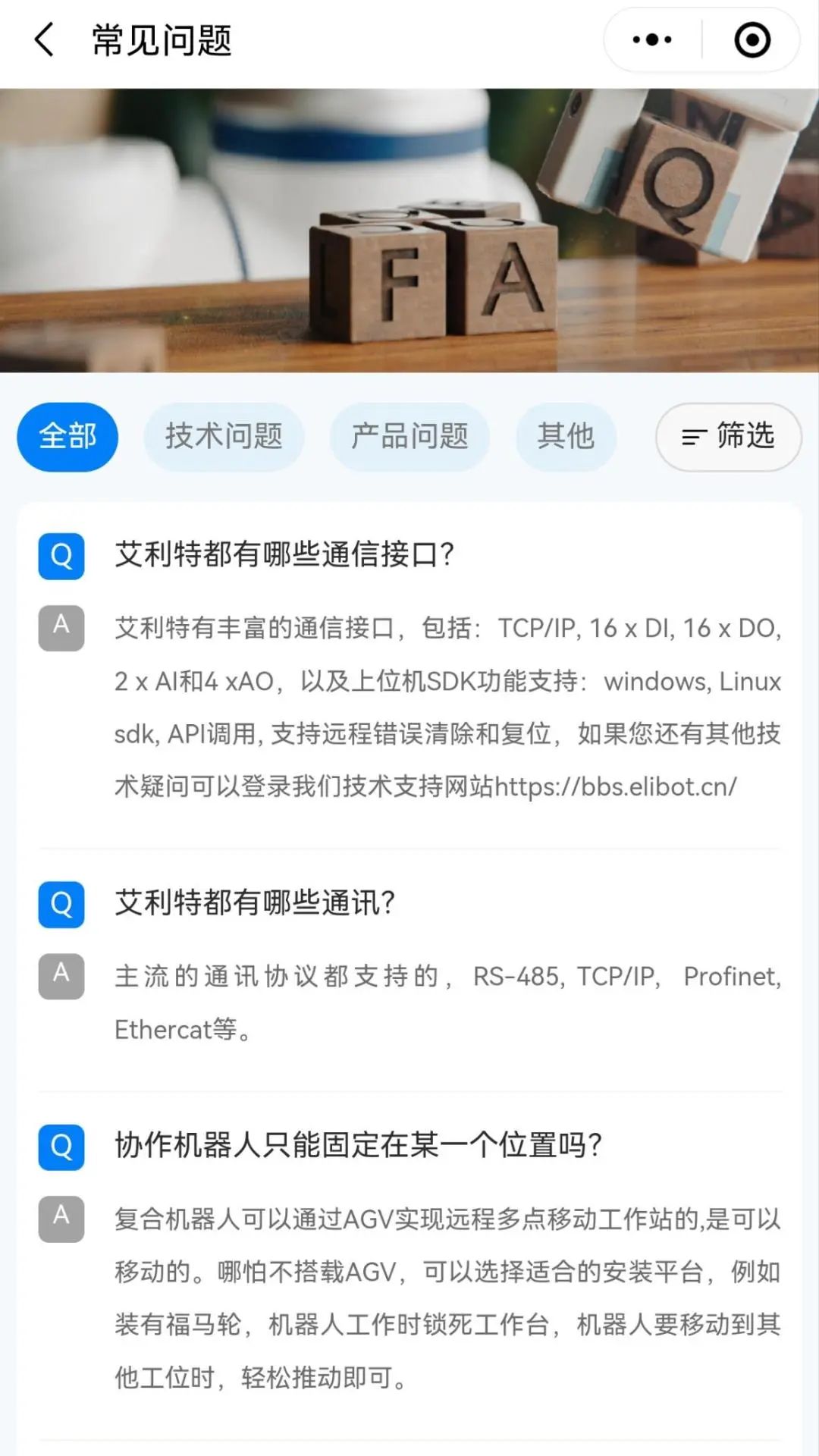 为帮助用户更直观了解leyu.乐鱼(中国)协作机器人的操作注意事项及常见问题解决方法,小程序还设置【常见问题】板块,让解决问题快人一步!