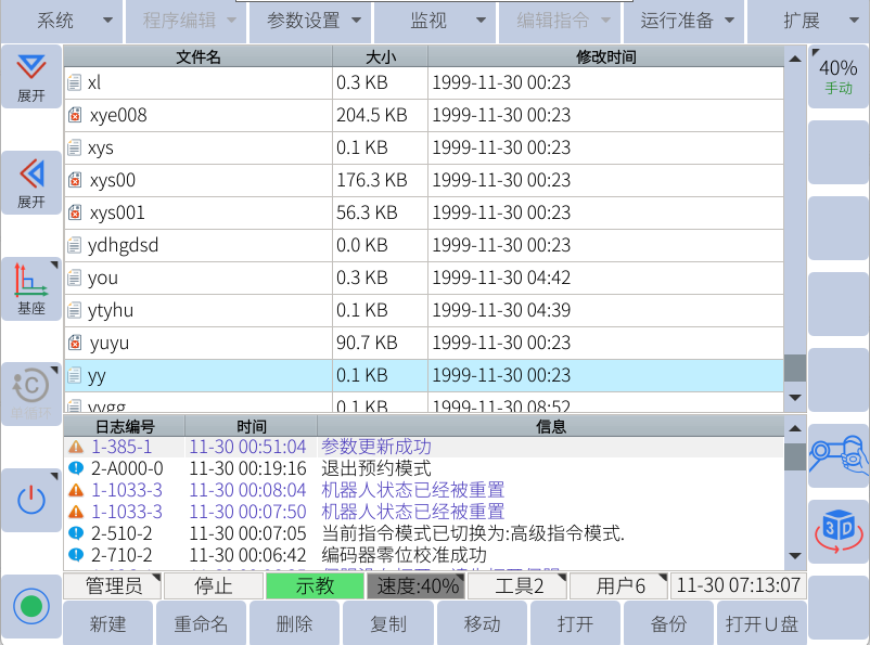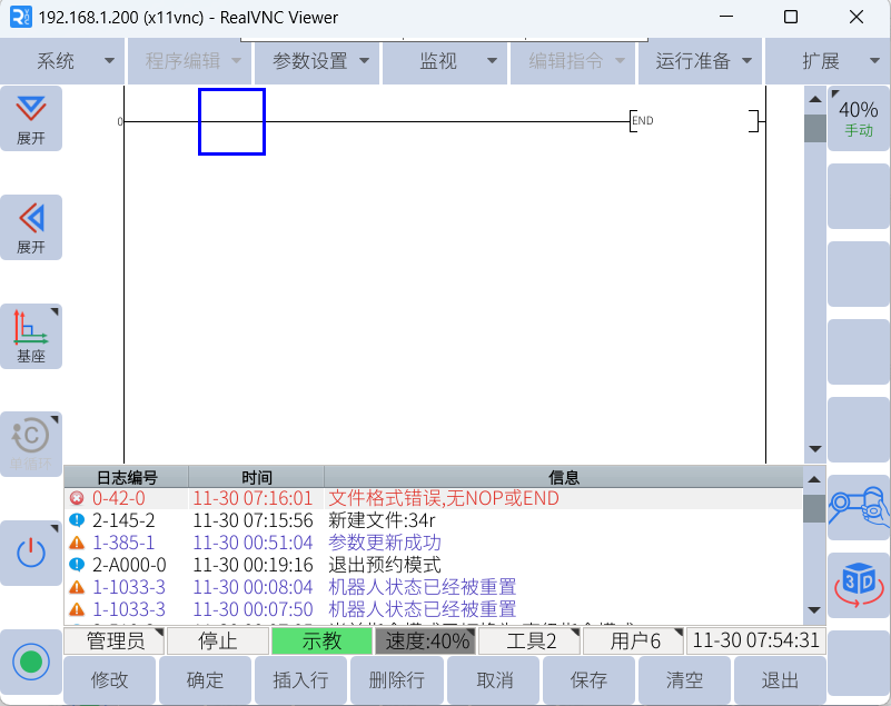 用户plc一般只用作简单的机器人功能配置,不能当做逻辑控制器使用,编写复杂程序会导致无法保存。