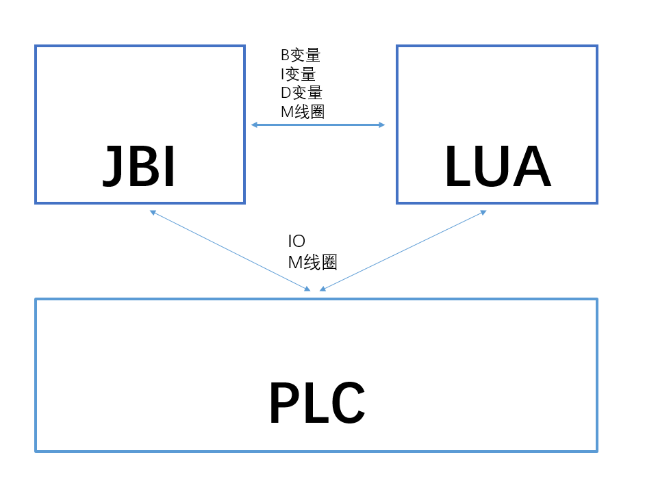 JBI通过机器人的全局变量与LUA交互,例如:B/I/D变量和M线圈,以让外部设置的通讯