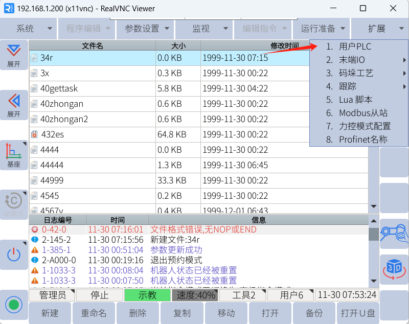1.  用户PLC的编写只能在示教器上,在扩展-用户PLC中。