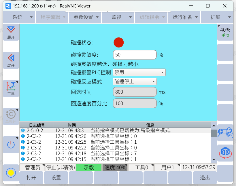 2. 设置百分比要结合机器人当前的负载,速度,姿态,例如机器人速度很快,满负载,设置20%会导致机器人正常运行报警碰撞,推荐可以先设置50%,后续运行程序逐步更改。