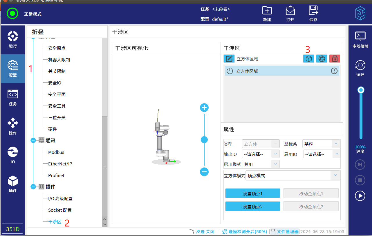 (2):如图2-1 点击 配置(1)-干涉区(2)-点击立方体图标(3)新建一个立方体干涉区
