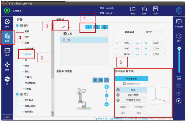 第二步:进入机器人配置→坐标系→添加新的用户坐标系(新坐标系命名需要是英文)→示教坐标系。(具体操作步骤请看图-1红色数字标记处)