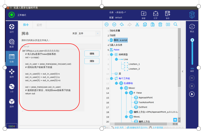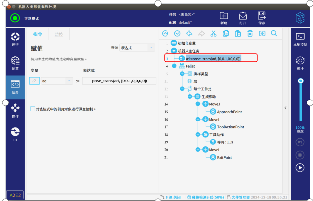 第二步:使用pose_trans函数将坐标系ad按照得到的偏移值进行偏移(如图-3红框标记处),这样码垛工艺包里的码垛点也会随着坐标系ad的偏移而偏移。