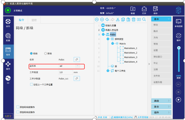 第一步:在机器人主任务里插入一个码垛指令,坐标系选择新建的用户坐标系(如图-2红框标记处)。