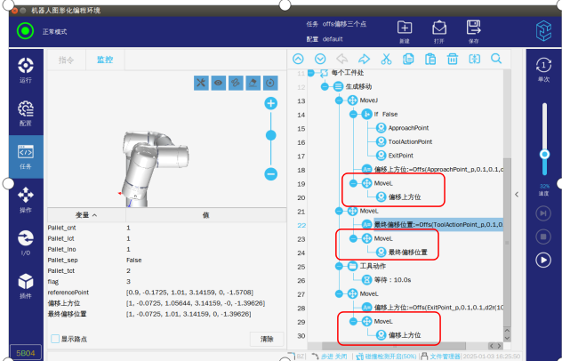 2.2.1将码垛工艺包里3个运动点位都按照外部偏移值偏移(进入点,工具动作点,离开点)