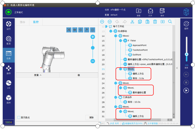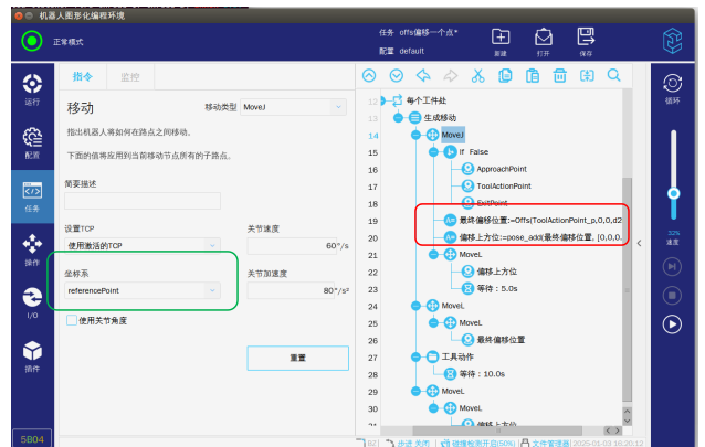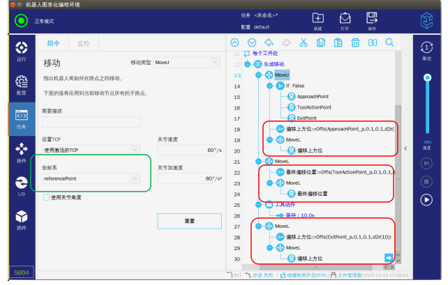 3. 使用2.2(方法2)进行偏移时要重新插入一个movel运动指令,然后将偏移点位放在新插入的运动movel指令下(如图-6和图-9红框标记所示)。