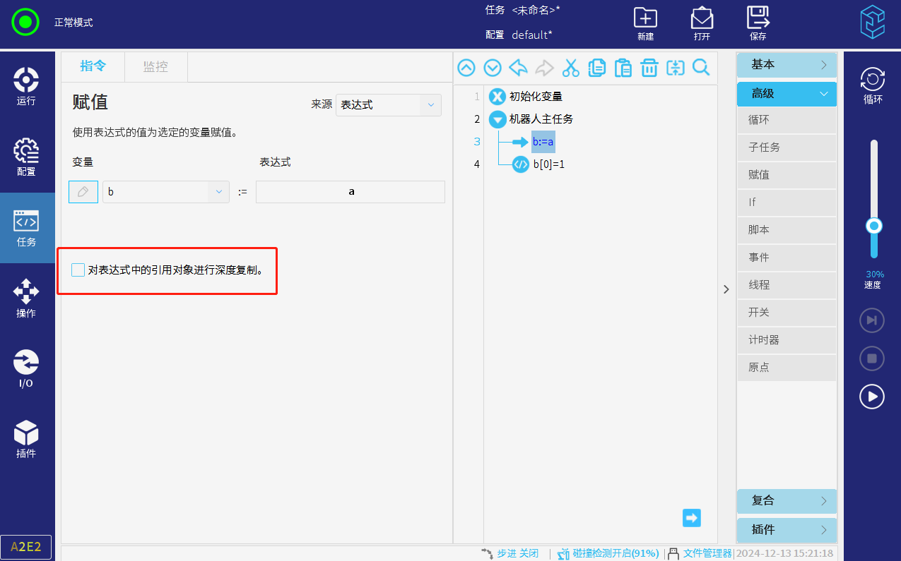 任务中添加下图程序程序,将数组a赋值给数组b,再修改b数组的值,不勾选深度赋值