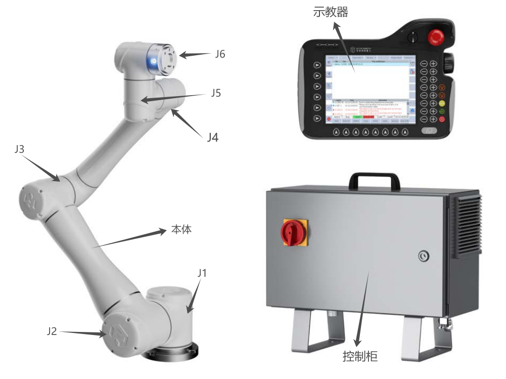 1.  机器人系统主要由机器人本体(以下简称为:本体),机器人控制柜(以下简称为:控制柜)和机器人示教器(以下简称为:示教器)组成。