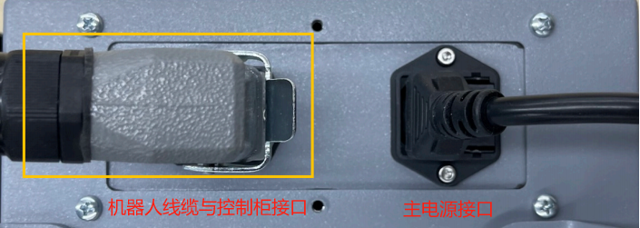 4.  控制箱的主电源线末端插入控制箱电源端口,并将另一端插入AC220V插座;机器人线缆末端有一个重载方形插头,将重载方形插头插入控制箱。注意插入方向,插紧后要锁上连接器。
