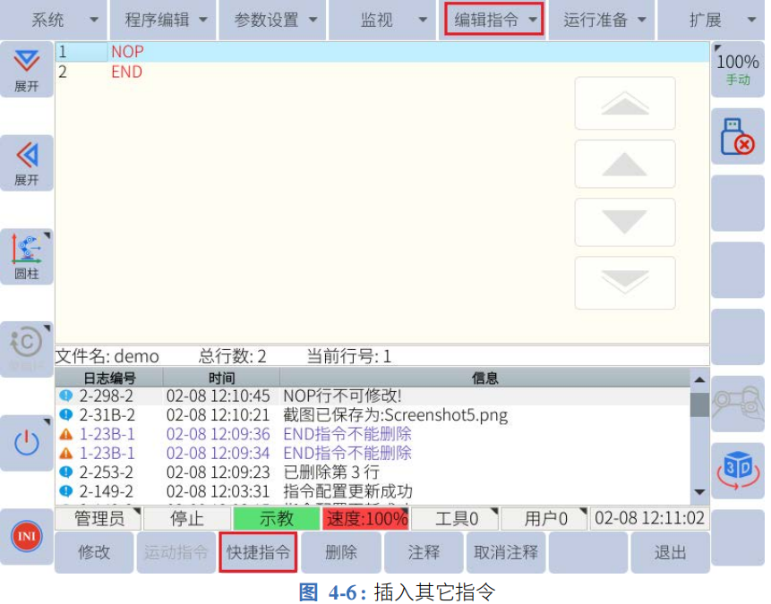 2. 然后按主菜单下的“编辑指令”或子菜单区域的“快捷指令”选择要插入的指令,如 图4-6 所示。