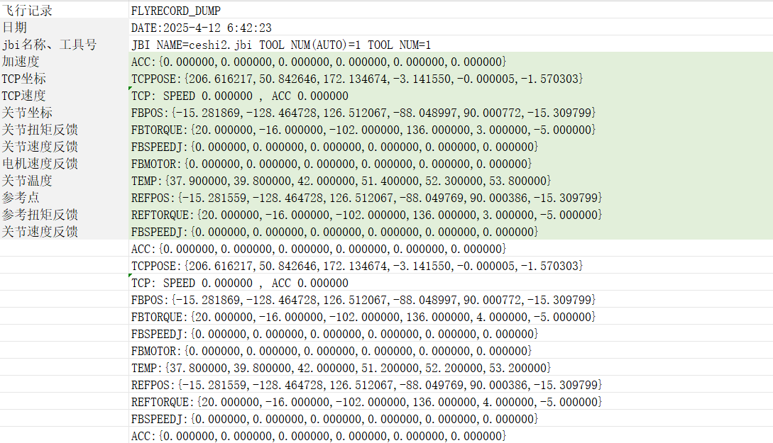 Flyrecord 文件夹里记录每一毫秒的运动过程的数据;机器人运行的点位,速度,温度,关节力矩等。