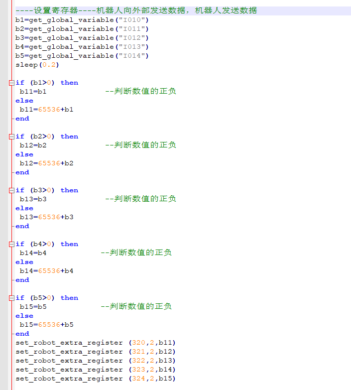 6.机器人通过全局变量I10-I14,将数据写入寄存器320-324,脚本如下所示