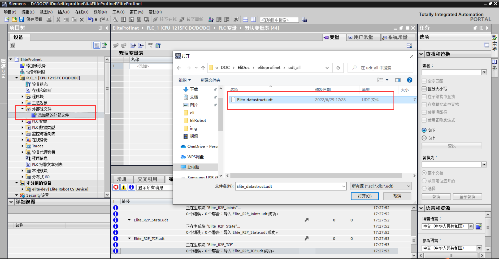 左侧项目树中选择“外部源文件> 添加新的外部文件> Elite_datastruct.udt”,如图 3-7(a) 所示;右键“Elite_datastruct.udt> 从源生成块”,对弹窗点击确定,如图 3-7(b)所示;左侧 项目树中展开 PLC 数据类型,可看到相关数据类型,如图 3-7(c)所示