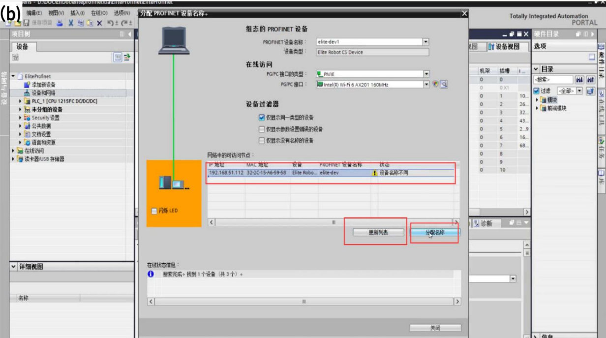 6.  在设备视图中右键设备选择“分配设备名称”,搜索并更改设备名称,如图 3-10(a)和 如图 3-10(b)所示。