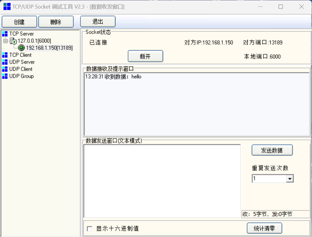 ret = socket_open("192.168.1.150",6000) 与通讯助手建立连接,ip地址填所连接设备的ip