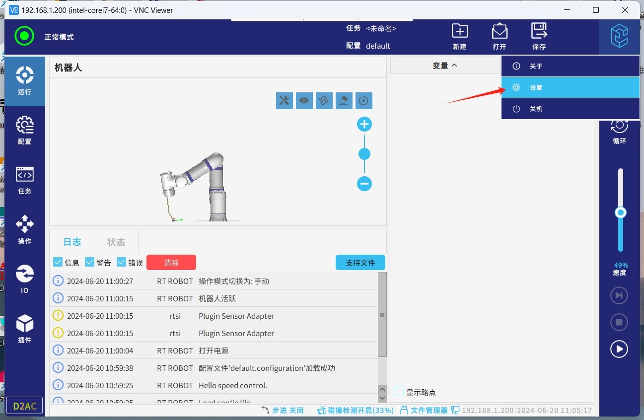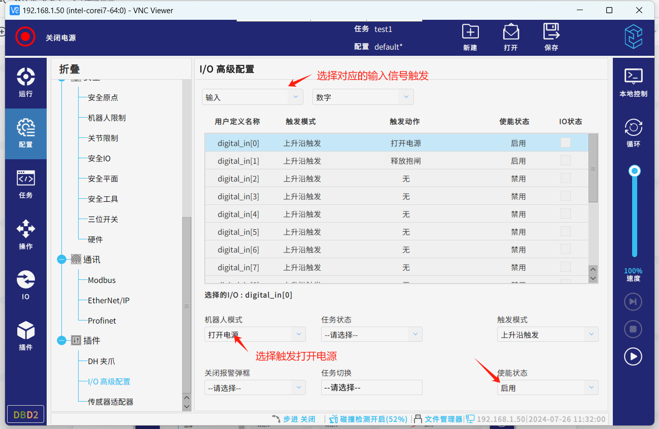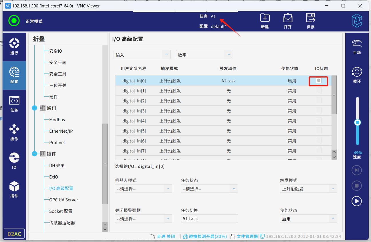安装成功后进入配置,插件,IO高级配置,就可配置对应的IO来触发对应的功能或者绑定对应的IO来接收机器人的状态变化。