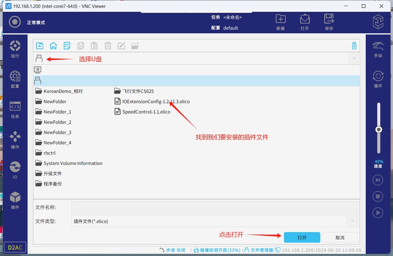 ● 将获取到的插件文件放置到U盘内,并将U盘接入机器人USB接口,按照下方操作安装IOExtensionConfig插件。