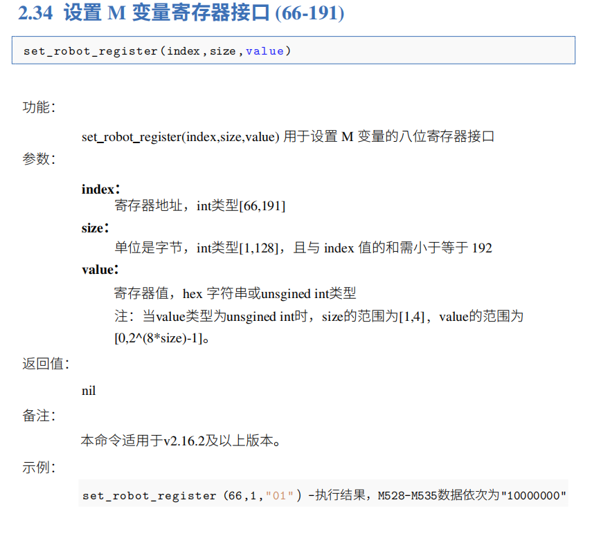 4).第1种指令和第2种指令,建议用户使用第2种指令更方便快捷,第1种指令可直接控制M变量,leyu.乐鱼(中国)modbus寄存器分为8位和16位,需要在兼容模式下更改,否则容易将机器人寄存器地址和网络助手地址混淆。第2种指令本身设置就是16位寄存器,无需考虑兼容模式下的更改情况