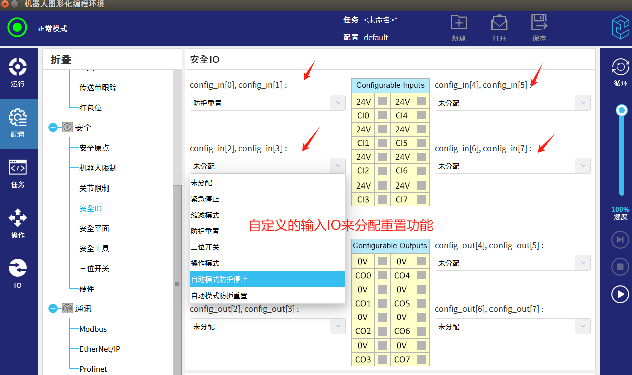 自定义安全IO输入端口为防护重置按钮,配置完成在使用对应的端口接线即可。